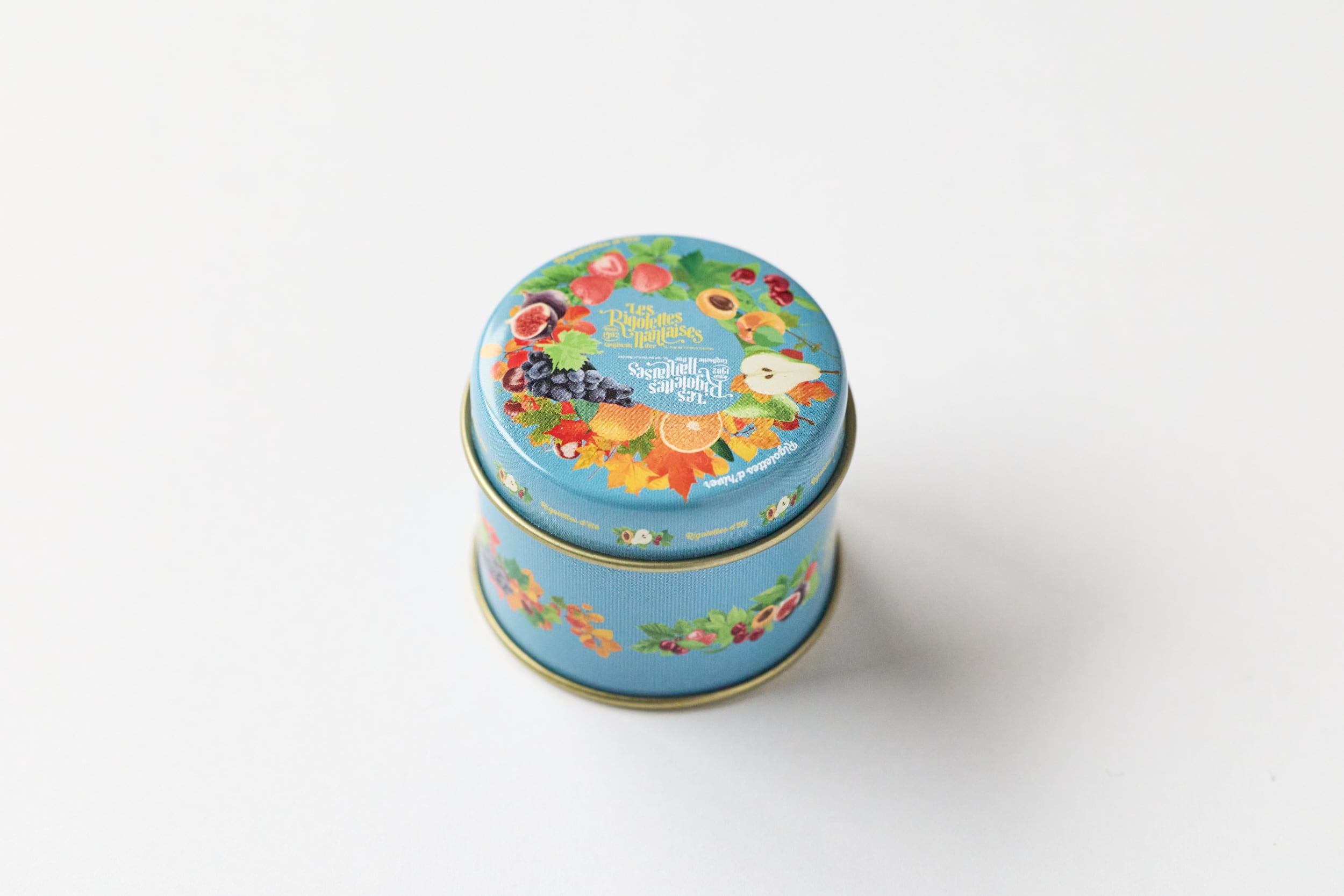 青い缶には、季節ごとに変わる5種のフルーツピューレが。