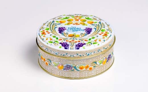 白地にフルーツ柄の缶は、1902年当時と同じデザインをほどこした復刻版。 5種のフルーツ(レモン、オレンジ、ラズベリー、カシス、パイナップル)は人気NO.1