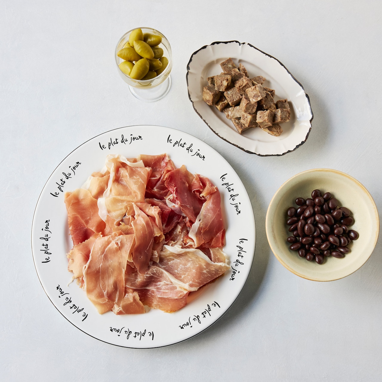 シャルキュトリボックス【ソレイユ】は、洗練された味わいと美しさを兼ね備えた一品です。生ハム4種、濃厚なパテ1種、上品な風味のオリーブ、キフキフが詰まったプレミアムな組み合わせで、特別な食卓を演出します。
